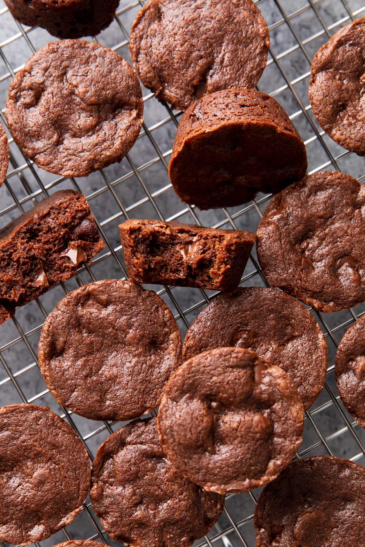 - Bake for 14 minutes, then cool in the pan for 20 minutes. Place a cooling rack on top of the pan, then, holding both the pan and the rack, flip them upside down. Bang the pan to release the brownie bites, or use a butter knife to release bites. Enjoy!