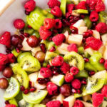 Sweet, tangy, and refreshing: this festive & easy Christmas Fruit Salad is colorful and delicious! Honey lime dressing coats festive red and green fruit like grapes, kiwis, and pomegranate in the best recipe for Christmas fruit salad! Perfect for Christmas morning & brunch.